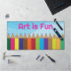 Pencils colorés Art is Fun Desk Mat Ce tapis de bureau est aussi pratique qu'élégant. Parfait pour l'écriture, la dactylographie ou l'artisanat, notre tapis de bureau multifonctionnel va égayer tout bureau ou espace de travail avec une impression de sublimation colorante de bord à bord. Fabriqué en néoprène de 3 mm d'épaisseur durable, il dispose d'un support antidérapant pour réduire le glissement ou le glissement sur la plupart des surfaces.