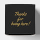 Personalized Fabulous Las Vegas Marquee design on party favour boxes for a 21st Birthday Party in Vegas, shown in black and gold with custom "Thank you for being here" wording which can be edited to suit your style and personality. All wording, and the background colour of the box and fonts can also be changed.