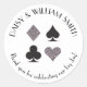 Faux silver glitter and black card suits are circled by customizable text making these round stickers perfect for all kinds of projects and occasions. Use them to label favours for wedding guests, to close envelopes and more.