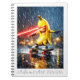 This dynamic artwork features a fierce anthropomorphic banana skateboarding through a rain-soaked city at night, blasting red laser beams from its eyes. Wearing sneakers and gloves, the banana character exudes rebellious energy and humor. The cinematic lighting, motion blur rain, and glowing street reflections create a dramatic, high-impact scene. Rendered in a hyper-realistic, stylized 3D illustration style, the image blends absurd comedy with action-movie intensity, making this notebook perfect for creatives who love bold, playful, and edgy designs.