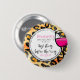 A pin back button for a bachelorette party. A leopard spots pattern for a background. A cool looking wine glass outlined in thick black ink. The wine inside the glass is hot pink. Vivid and bright colours. Personalize with your bachelorette info on a white hand drawn circle. Last fling before the ring written in a cool trendy font.