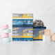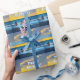 Beach series: A brilliant surfing gift-wrap design with an amusing birthday pun - Happy Surfday instead of Happy Birthday. The photograph shows three surfers going for the last dip of the day at Bantham Beach in Devon.