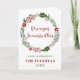 Green and red Christmas holiday wreath holiday card, with the words Merry Christmas in Latvian: Priecīgus Ziemassvētkus.