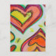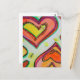 Les coeurs jaune, pêche et orange forment deux coeurs concentriques qui glissent vers l'autre bout à bout. Les points de couleur jaune pâle sont comme des confettis entre les coeurs. La peinture à l'aquarelle a une légère couche d'or et de rose sur le dessus.