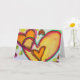 Peach and orange hearts connect like blowing bubbles drift together. A green outline traces each heart. Pale yellow colour dots are like confetti between the hearts. The watercolor painting has a light layer of gold and pink on top. Personalize this card with your own text and images using the customize it option. Detail from Inspirational Word "Laugh" painting.