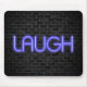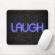 Illuminated urban brick wall with LAUGH text in glowing purple neon lights.