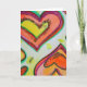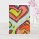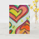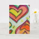 Yellow, peach, and orange hearts form two concentric hearts gliding towards each other tip to tip. Pale yellow colour dots are like confetti between the hearts. The watercolor painting has a light layer of gold and pink on top. Personalize this card with your own text and images using the customize it option. Detail from Inspirational Word "Laugh" painting.