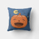 Adorable laughing Halloween pumpkin. A dead tree, a creepy mansion, some bats, and the moon are seen on the background.