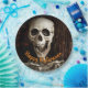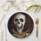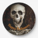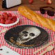 Fun Halloween paper party plates feature slightly creepy, kinda funny photo of laughing skeleton with customizable text