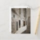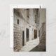 Postcard of laundry consisting of white blankets hanging to dry in the sun on the facade of a white stone house in an alley with sandstone stairs in a town in Italy, creating a typical Italian/mediterranean street view.
