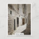 Postcard of laundry consisting of white blankets hanging to dry in the sun on the facade of a white stone house in an alley with sandstone stairs in a town in Italy, creating a typical Italian/mediterranean street view. It has a white edge and the text 'Toscana'.