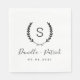 This modern rustic logo-style design has a laurel branch frame with your monogram initial. Personalize the template with the bride and groom's names or monogram initials. Add your wedding date, the city, state or venue name or any other custom text. Use the design tools to choose any colours, edit the fonts or upload your own photos to create custom wedding cocktail napkins to match your wedding colours and style!