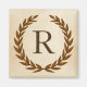 A delicate laurel wreath is layered over a parchment paper background in the classic Roman style. This design is personalized with the monogram "R" in a rich sienna tone.