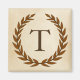 A delicate laurel wreath is layered over a parchment paper background in the classic Roman style. This design is personalized with the monogram "T" in a rich sienna tone.