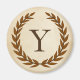 A delicate laurel wreath is layered over a parchment paper background in the classic Roman style. This design is personalized with the monogram "Y" in a rich sienna tone.