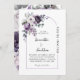 This wedding invitation features an elegant floral motif with soft purple, lavender, and white blooms accented by greenery in the top corner. A thin, curved purple border frames the text, which is centered and styled in a graceful serif font. The phrase “YOU’RE INVITED” runs vertically along the right edge, adding a modern touch. The layout is clean and formal, with the event details clearly presented and a note that a reception will follow. The overall design blends romantic charm with refined simplicity