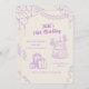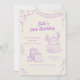 This invitation card features a playful and whimsical design with a pastel beige background and lavender-purple line art illustrations. The centerpiece is a two-tiered birthday cake, dripping with icing and topped with swirls of cream, candies, and candles. The cake is adorned with a bow, making it look festive and sweet.