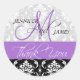 Purple, Black and White Damask Wedding Favour Thank You Stickers personalized with Monogram. initial and bride and groom names. By Elke Clarke ©. An elegant way to label your wedding favours. Need a different colour combination? Contact us. More designs at http://www.luxuryweddinginvites.com. Graphics licensed for commercial use.