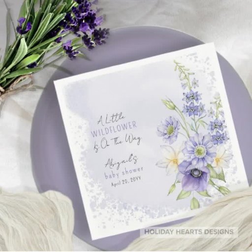 Pretty lavender wildflowers on a watercolor splatter background are the perfect backdrop for your occasion details on this "Welcome" baby sprinkle design. Composite design by Holiday Hearts Designs.