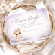 A sweet and whimsical baby shower design featuring an adorable bunny surrounded by soft lavender florals and delicate butterflies. The gentle watercolor palette of lilac, lavender, and soft greenery creates a dreamy nursery aesthetic with a light storybook feel. A tiny bow and tutu add an extra charming touch, making the design perfect for a soft, feminine celebration. Ideal for a lavender themed baby shower with a cute woodland-inspired atmosphere.