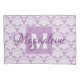 This beautiful pillow case features a classic white damask pattern over a lavender or dusty purple background. The design is personalized with a monogram initial letter as well as a customizable name. Perfect for decorating any bedroom, apartment or dorm room. Great gift for a girl going off to college who wants a classic yet elegant style on her bed.
