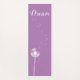A bright white dandelion with blowing seeds and the word, Dream, written in a fancy script decorate this yoga mat on a lavender background, making it perfect to stretch out on at your next class.