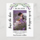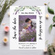 A modern wedding Save the Date photo card. Decorated with lavender florals, flowers and eucalyptus greenery. Personalize and add your photo, date, names.