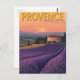 This beautiful card features a vintage-style illustration of the rolling lavender fields of Provence, France, at sunset. The design captures a classic scene of a traditional stone building nestled among the vibrant purple rows, with cypress trees and hills in the background. The warm, golden hour light and retro typography give it the feel of a timeless travel poster. It's the perfect card for a note from your travels or a gift for a nature and art lover.
