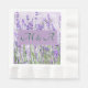 Coined lunch napkins with soft lavender and green inspired by the beauty of countryside lavender flowers with custom names for your wedding celebration.