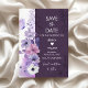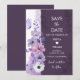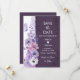 A romantic purple floral wedding save the date card featuring soft watercolor flowers in lavender, blush, and white, accented with delicate botanical line art and a graceful butterfly. The elegant vertical layout with a deep plum panel creates a refined and feminine look, making it perfect for announcing your wedding date in style. A beautiful choice for garden weddings, spring weddings, summer celebrations, and coordinated floral wedding stationery suites.