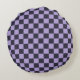 A vibrant chequered pattern with alternating black and lavender squares creates a bold, symmetrical grid. The design is balanced and visually striking.