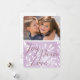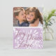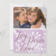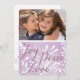 A pretty holiday photo card in lavender and white features watercolor lavender front with leaves and ferns of white with glittery look lavender text that reads Joy Peace Love and has an area to add your own photo. The card back is white with lavender leaves and ferns and an area you can add a last name and first names! Photography © Storytree Studios, Stanford, CA