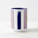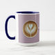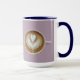 This latte mug features a top-down view of a latte art coffee in a lavender ceramic cup before a solid lavender background. The latte art features a white heart shape in the centre with swirling patterns radiating outward, creating a symmetrical design. The coffee is a rich brown colour with a smooth, creamy surface. The cup has a simple, modern design with a curved handle on the right side. The mug is a Combo Mug. The mug is a Navy Blue and White Combo Mug. The mug is a fifteen ounce size.
