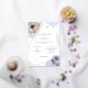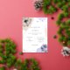Beautiful rose gold foil wedding invitation in white, lavender purple, and linen beige with the line art of a hand drawn flower, a twig of greenery, and shapes of colour with some rose gold spatter and elegant arrows.