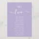 In the upper part, there is the table number written in a handwriting script and the word Table above, in smaller caps (hand letters). Under them, there are the 10 guest names, in similar hand letters. The background is lavender (light purple), all text is white.