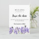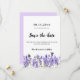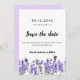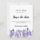 A modern and elegant Save the Date for a wedding. A white background decorated with watercolored lavender flowers. Personalize and add a date and your names. The text: Save the Date is written with a large trendy hand lettered style script.