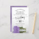 This beautiful wedding invitation features a romantic design with a single long stemmed lavender purple coloured rose laying on its side and reflecting in a pool of water. The typography features lacy script calligraphy and a sophisticated layout. The back is a light marbled purple colour. Wonderful way to invite your friends and family to share in your joy on your special day.