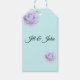 A charming light blue gift tag featuring soft lavender roses and the couple's names in an elegant black script, perfect for spring or summer wedding favours, garden-themed bridal showers, or personalized party gifts.