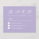 A simple, minimalist budget RSVP for a wedding. It has only white text on lavender (purple) background. The title RSVP and the letter M are written in an elegant calligraphic script, the rest in caps.