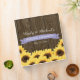 A SUNFLOWER THEMED WEDDING ORGANIZER PLANNER BINDER WITH A COUNTRY CHARM AND A RUSTIC FEEL. A WOOD GRAIN WOODEN FENCE OR BARREL LOOK DESIGN AND A NAIL HEAD TRIM. WRITE WHATEVER YOU WANT ON THE LAVENDER LIGHT PURPLE PRINTED RIBBON BANNER AND ADD THE INITIALS OF THE BRIDE AND GROOM INSIDE THE CARVED HEART DESIGN ON THE BACK OF THE ALBUM. A BOUQUET OF GOLDEN YELLOW SUNFLOWERS HAVE A VINTAGE AND PAINTERLY LOOK. PERFECT FOR A COUPLES WEDDING SHOWER, ANNIVERSARY OR BRIDAL SHOWER WITH A BARNYARD BARN FARM OR FARMHOUSE THEME. DESIGN © CHRISSY H. STUDIOS, LLC. ALL RIGHTS RESERVED.