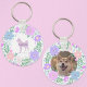Designed with a lavender floral ring, this keychain beautifully showcases your Shiba Inu. Customize the silhouette side with your pet's name for a unique keepsake. Upload a cherished photo on the reverse side to complete your design. A lovely choice for birthdays, holidays, or pet parents. The pastel palette gives it a clean, modern finish.
