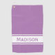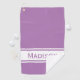 Play golf in style with this personalized golf towel. This design has a solid lavender (light purple) background colour with white stripes and a modern font. This is a terrific gift for women and girl golfers playing in golf tournaments or recreational golf. It's also a lovely gift for golf coaches and instructors. The name and colour can be customized in the personalization options. Change colours to your favourite combination or match your golf bag or team colours.