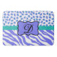 Decorate your bath or other room in your house with this colourful rug with your monogram. You will love this sophisticated and stylish combination of the popular wild african animal zebra stripe and leopard or cheetah skin design. This trendy periwinkle lavender purple and white zebra and leopard print pattern is available in several colour combinations. A periwinkle lavender emblem on a turquoise teal blue or aqua stripe creates a personalization area for your monogram or name. This is fully customizable and is available on many coordinating products in this store.