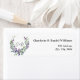 White background. Decorated with a lavender and eucalyptis wreath. Personalize and add your name, address. Add your first names initials. Black text.