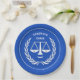 Law school grad party plates featuring creative scales-of-justice personified. To personalize edit text to add name of lawyer.