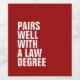 Want to know what this wine pairs well with? A law degree! Celebrate a law school graduation with this fun wine label. Anything goes on this hilarious customizable wine label! Great for a friend gift, your classmates and more. The funny wording is up to you or you can leave it as-is to read "pairs well with a law degree." Other colours also available