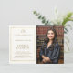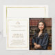 Celebrate your law school grad - or yourself - with this elegant, classic law school graduation photo invitation with an ivory white and gold theme. Replace the scales of justice with the logo of your school or leave it as is. The contemporary typography design is elevated by the gold hues and the minimalist layout. A brushed faux gold frame decorates the typography area. Customize every line of text. Ivory white and faux gold.