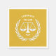 Creative law school graduation party napkins featuring funny scales-of-justice personified on gold background. Edit text to add name of lawyer.