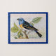 Puzzle (various sizes) with the Lazuli Bunting Bird in blue, yellow, black, and white on colourful background of green leaves and branch. Looks like an audubon image.