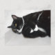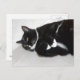 Postcard with cute lazy black and white tuxedo cat lying on a table